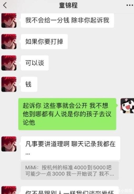 1月1日,开年第一天,一位女生在社交平台发布她与童锦程的聊天记录,原因是自己怀孕了,但是童锦程不管她和孩子,一气之下才曝光的。