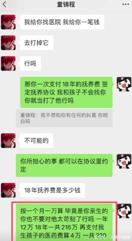 生下孩子之后,女方要求童锦程给出抚养费一个月1万来算,一共要给220万,再加一套房,还要平摊生孩子的费用。